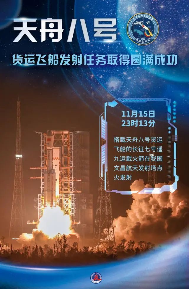 搭載天舟八號貨運飛船的長征七號遙九運載火箭,于北京時間11152313分在我國文昌航天發射場點火發射。