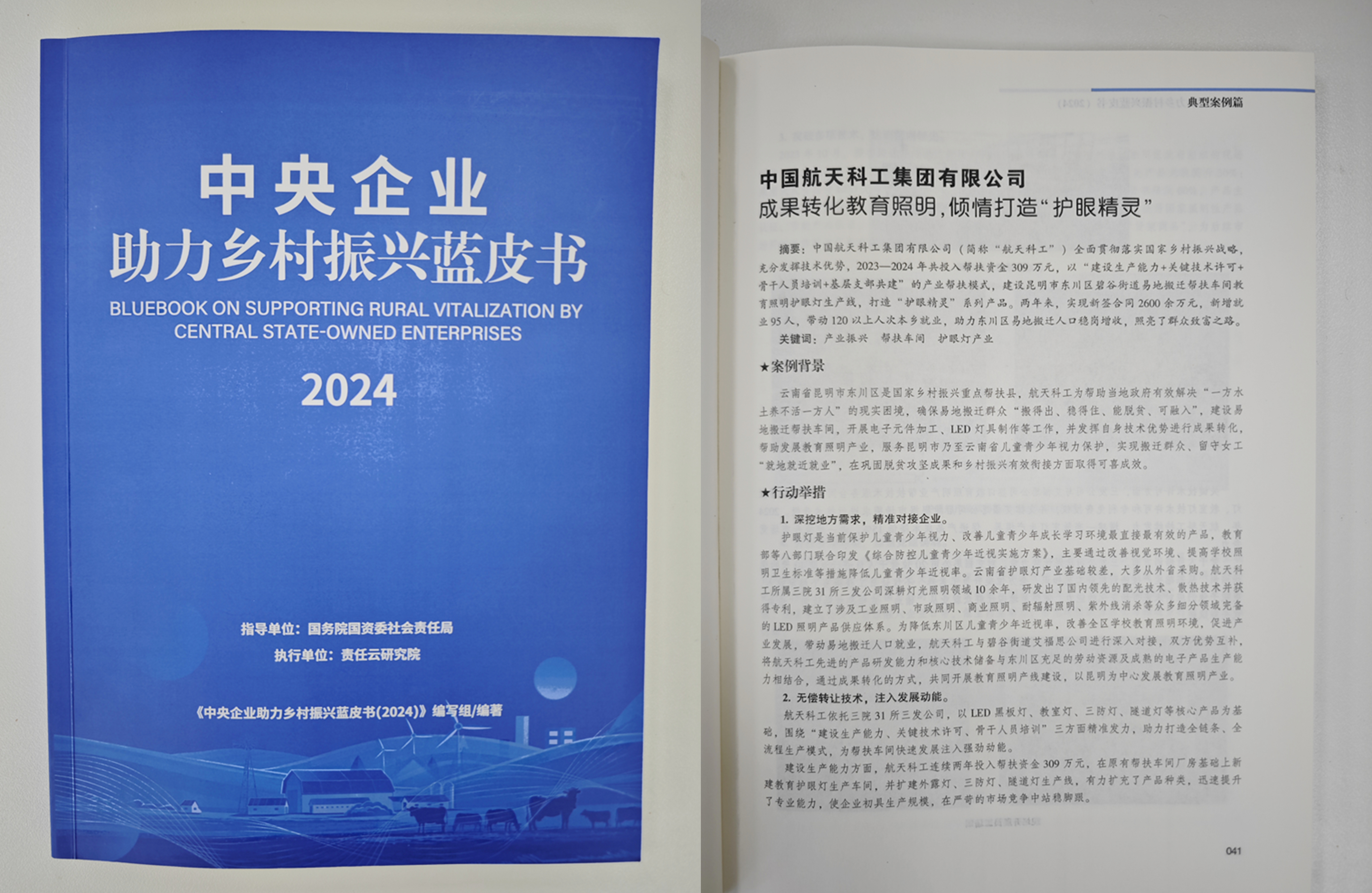 國務院國資委同步發布了《中央企業助力鄉村振興藍皮書(2024)》,集團公司《成果轉化教育照明,傾情打造“護眼精靈”》案例入選。該案例中,集團公司充分發揮技術優勢,以“建設生產能力+關鍵技術許可+骨干人員培訓+基層黨支部共建”的產業幫扶模式,建成昆明市東川區碧谷街道易地搬遷幫扶車間教育照明護眼燈產線,打造“護眼精靈”系列產品。兩年來,實現新簽合同2600余萬元,新增就業95人,帶動120以上人次本鄉就業,助力實現東川區易地搬遷人口穩崗增收,照亮了群眾致富之路。本項目是集團公司堅持“地方所需、航天所能”,促進幫扶地區產業發展,實現特色產業跨區域轉移的示范案例。