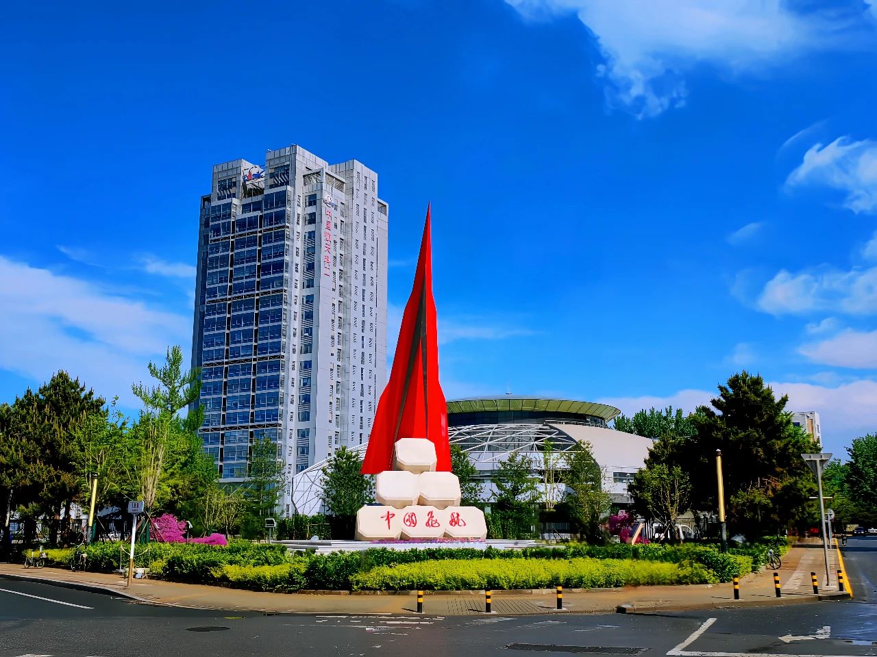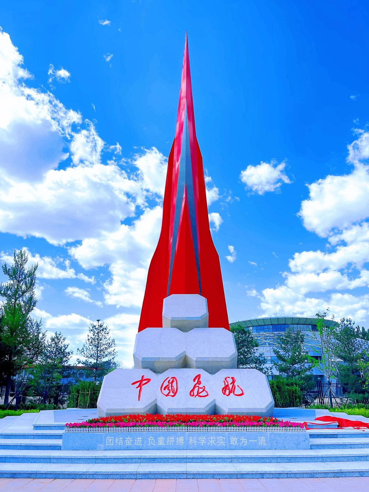 雨后初霽,碧空如洗。在三院辦公樓前廣場東南側(cè),“中國飛航·超越”雕塑巍然聳立,形如未來飛行器,在厚重的石基之上蓄勢待發(fā)、昂首蒼穹。