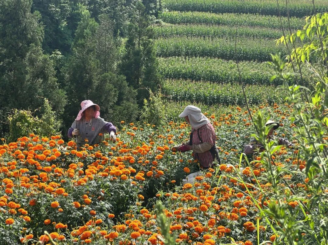 近年來,萬壽菊產業在云南省曲靖市富源縣大河鎮白馬村生根發芽。航天二院在白馬村幫扶援建了鮮花收儲點,使當地農戶通過種植萬壽菊實現大幅增收。圖為白馬村萬壽菊迎來豐收。