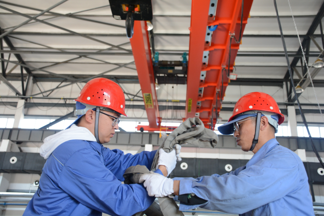 紅峽公司某車間工房內,兩名職工熟練地用吊繩對產品進行捆綁,粗糲的吊繩在兩人手中靈活傳遞,幾個回合下來,產品被穩(wěn)穩(wěn)地固定住,為下一道工序做好鋪墊。