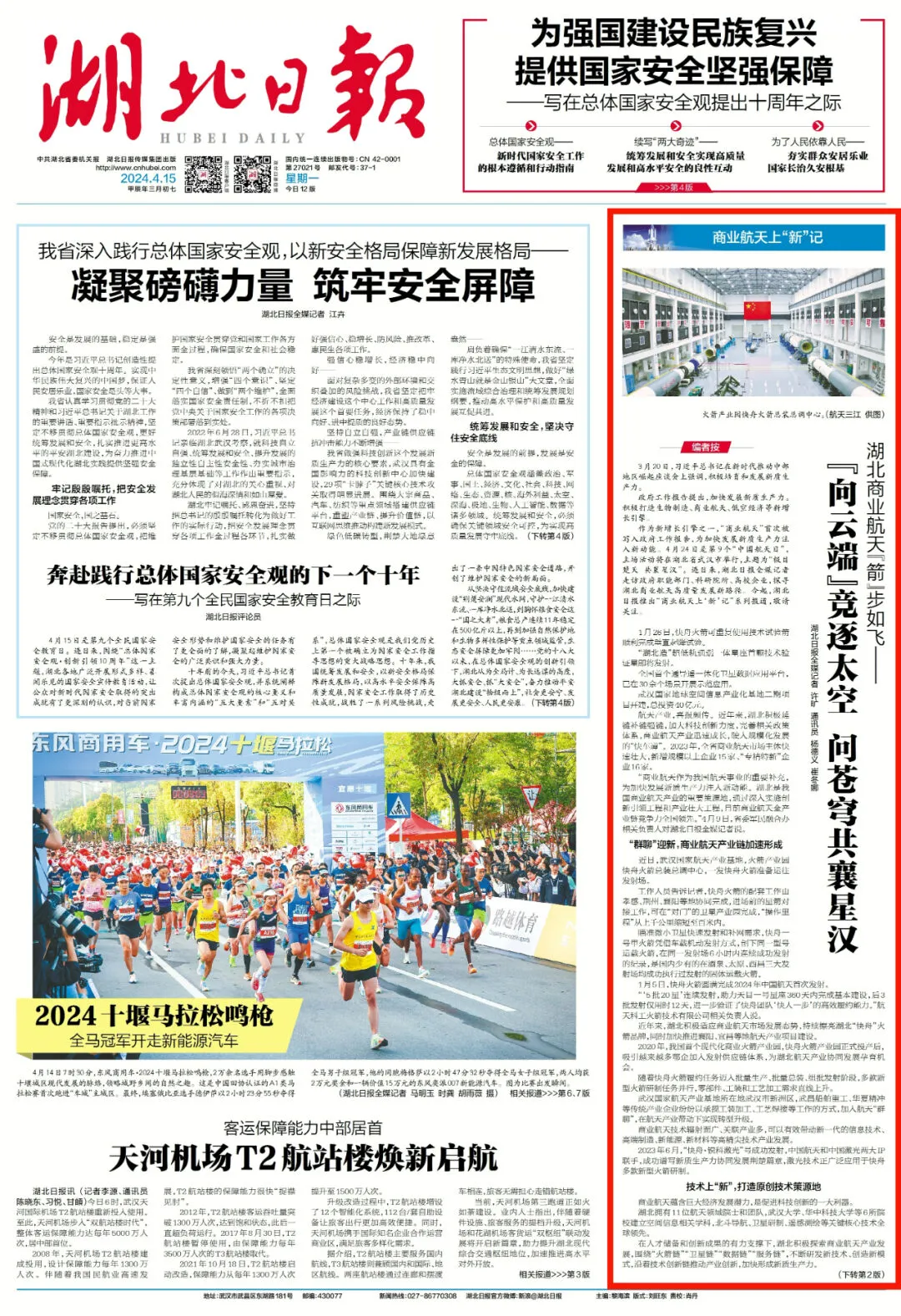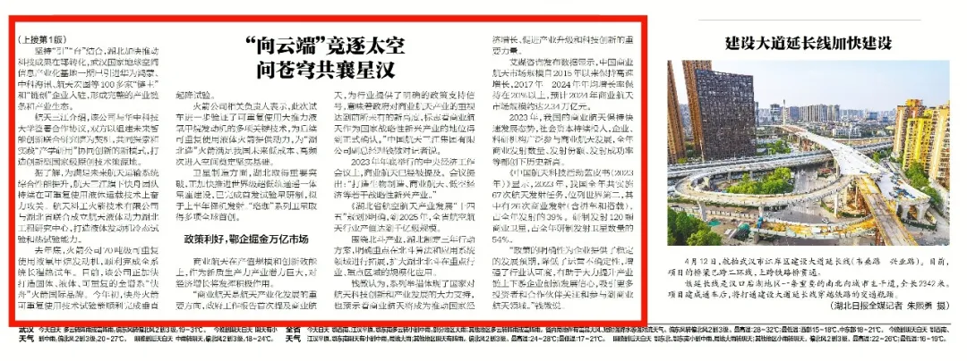 第九個“中國航天日”即將來臨,主題為“極目楚天 共襄星漢”。近日,《湖北日報》推出“商業(yè)航天上‘新’記”系列報道,首篇文章以《湖北商業(yè)航天“箭”步如飛——“向云端”競逐太空 問蒼穹共襄星漢》為題,聚焦湖北商業(yè)航天高質(zhì)量發(fā)展新路徑,重點報道了航天三江快舟系列火箭創(chuàng)新發(fā)展,持續(xù)發(fā)揮航天全產(chǎn)業(yè)鏈布局優(yōu)勢,打造創(chuàng)新型國家級原創(chuàng)技術(shù)策源地。