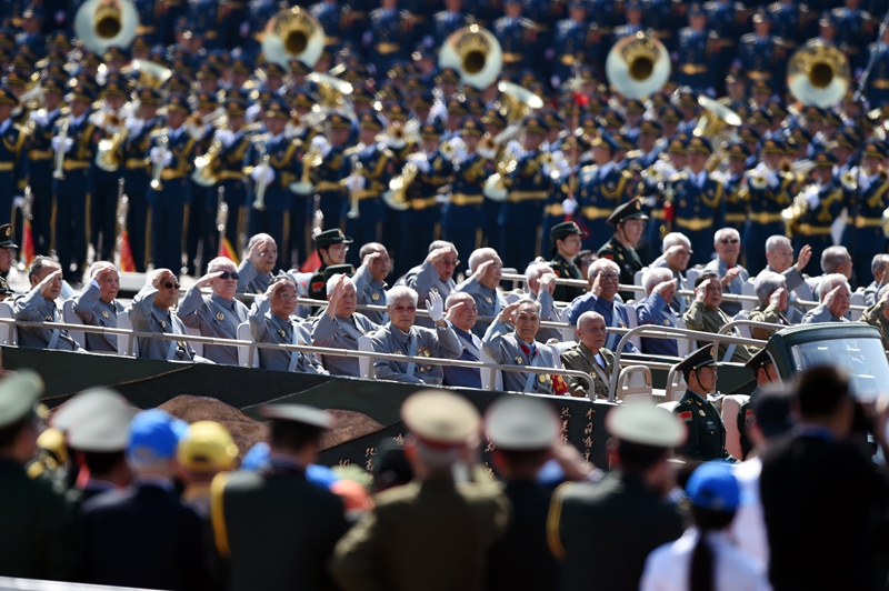 2015年9月3日,中國(guó)人民抗日戰(zhàn)爭(zhēng)暨世界反法西斯戰(zhàn)爭(zhēng)勝利70周年紀(jì)念大會(huì)在北京隆重舉行。這是抗戰(zhàn)老兵乘車(chē)方隊(duì)通過(guò)天安門(mén)廣場(chǎng)。新華社記者 王定昶 攝