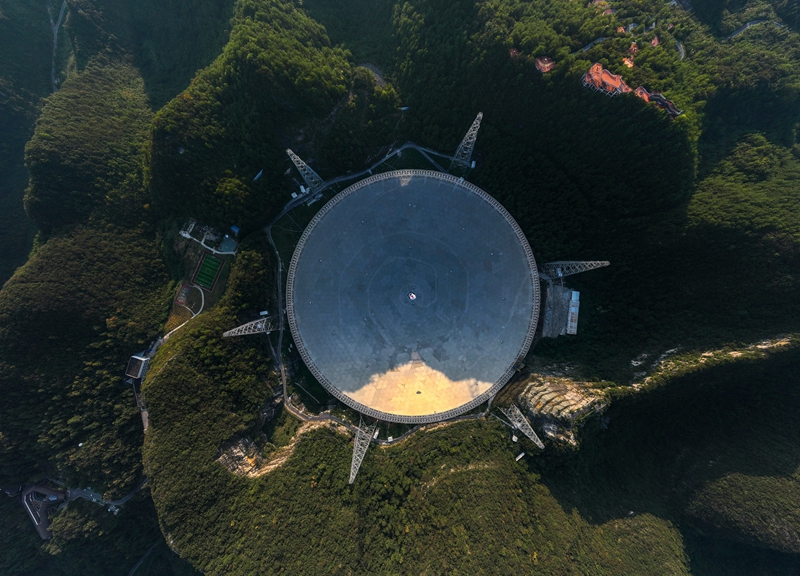 中國(guó)天眼在落日余暉中(無(wú)人機(jī)照片,維護(hù)保養(yǎng)期間拍攝,2024年9月25日攝)。新華社記者 劉續(xù) 攝