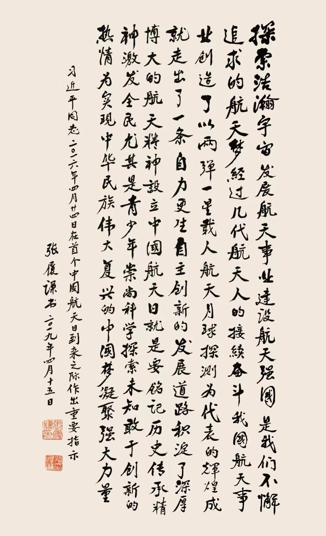 張履謙院士是我國雷達、電子對抗和航天技術領域的著名專家,中國工程院院士,是我國航天事業發展的親歷者見證人。本次書法展分為“領導指示”“航天精神”“對青少年的鼓舞”“詩詞格言”等四個專題,共展出張履謙院士書法作品百余幅作品。