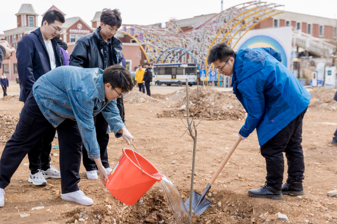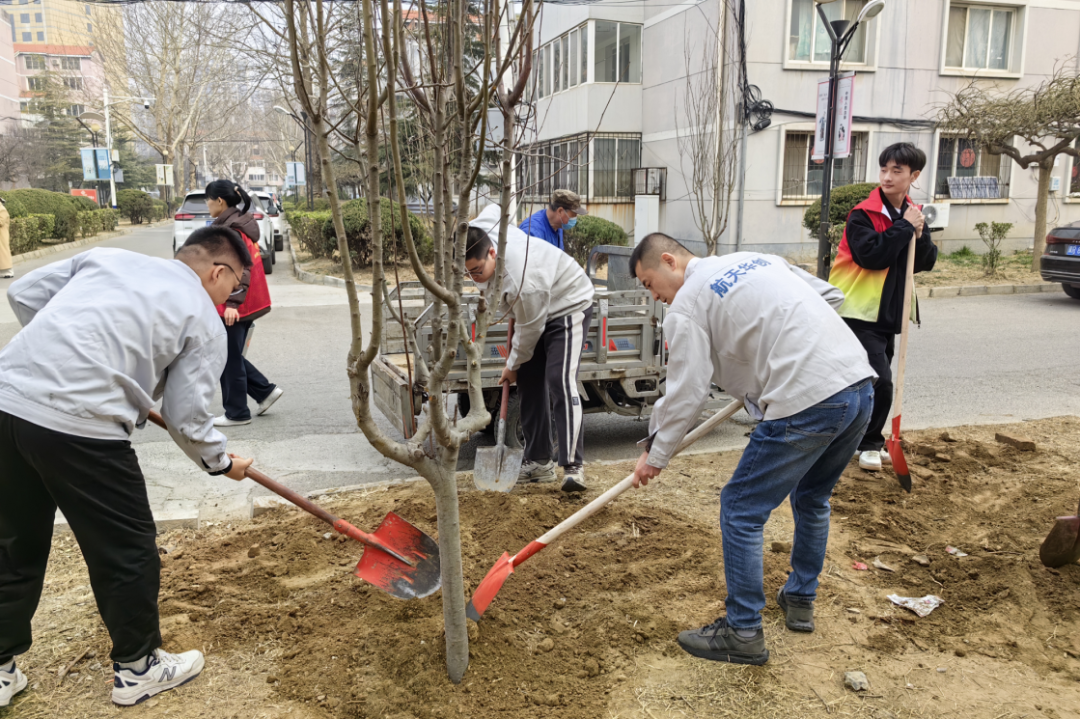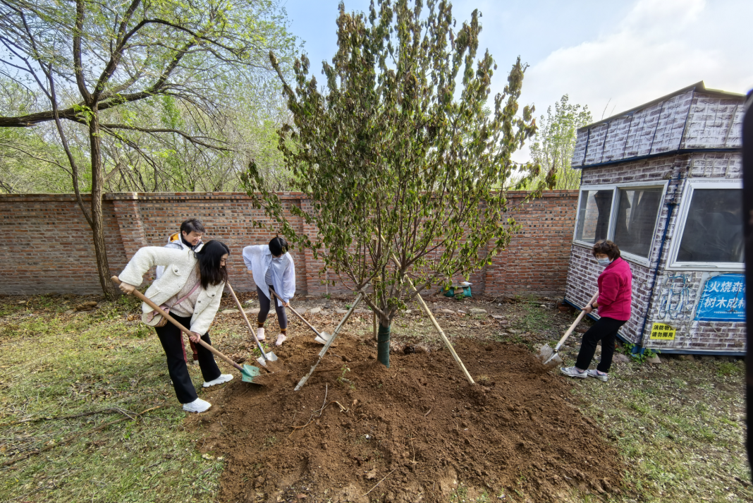 植樹現(xiàn)場,春和景明,一片繁忙有序的勞動景象。大家分工協(xié)作,默契配合,揮鍬鏟土、培土圍堰、提桶澆水,種下海棠、山楂、牡丹等樹苗。在和煦的春風(fēng)中,一株株樹苗錯落有致地挺立著,展現(xiàn)出勃勃生機(jī)。